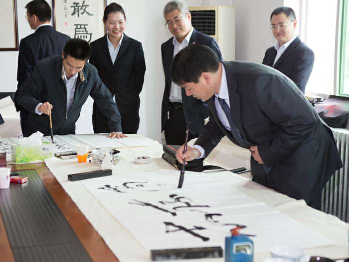 为弘扬传统文化,丰富员工业余生活,5月6日上午,球盟会体育-球盟会体育·(中国)官方网站举办了首届书画艺术学习交流活动。本次活动邀请了中国书法家协会会员孟云飞博士、中国书法家协会理事张铜彦先生、中国书法家协会编辑出版委员会副主任王荣生教授、人民艺术家协会理事于瑛先生等国内知名书画大师,各位书画大师在活动现场进行了艺术创作表演,挥毫泼墨,交流技艺,为球盟会体育-球盟会体育·(中国)官方网站留下了数十副墨宝,还对部分员工的书画作品进行了悉心指导。公司员工现场欣赏了书画大师的艺术创作,并聆听了有关书画艺术鉴赏知识的介绍,部分员工还在活动现场进行创作,听取书画大师的讲解示范和点评。